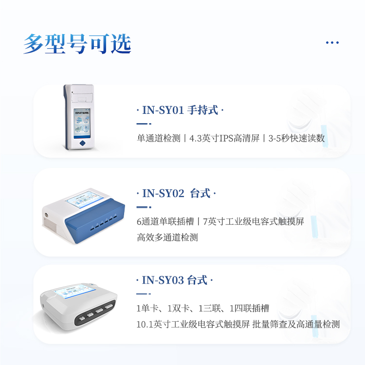 11、检测时间:< 5秒 (单卡及多联卡);可对样本进行胶体金定性/半定量检测。